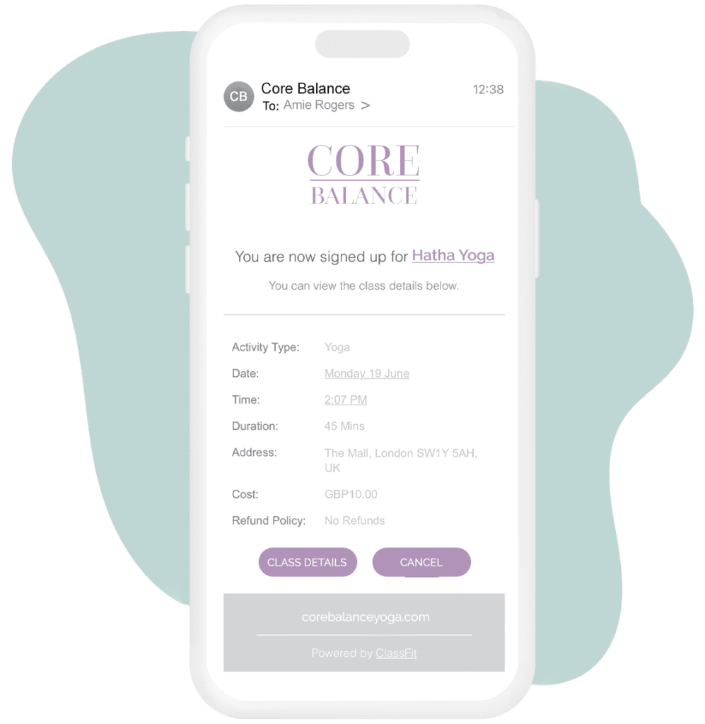 Every email that your customers receive will be branded in your colors. For example, class booking confirmation emails, confirmation emails for class bundle or membership purchases or waitlist emails when your classes are full. Any emails that you receive (as the organizer), i.e. notification that a customer has purchased a class bundle or membership, medical forms etc. will be shown in the ClassFit branding.